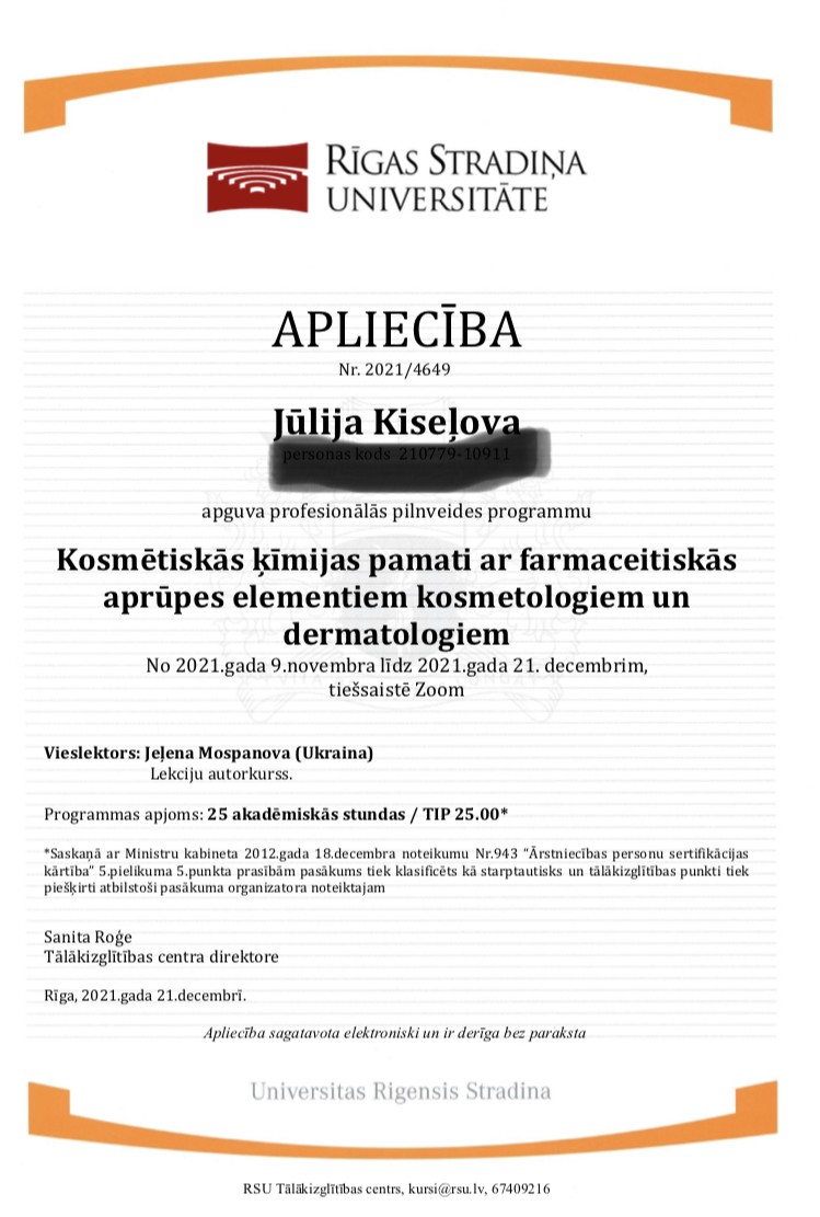 Strādāju tikai ar sertificētiem preparātiem un kvalitatīvu kosmētiku.