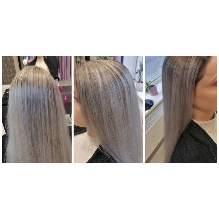 Balināšana šķipsnās, matu sakņu krāsošana tumšākā tonī un visu matu tonēšana.