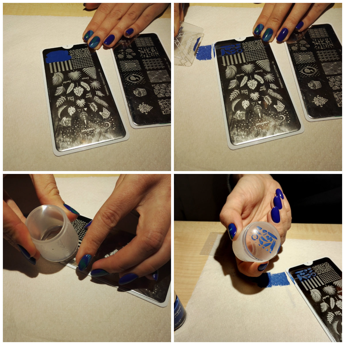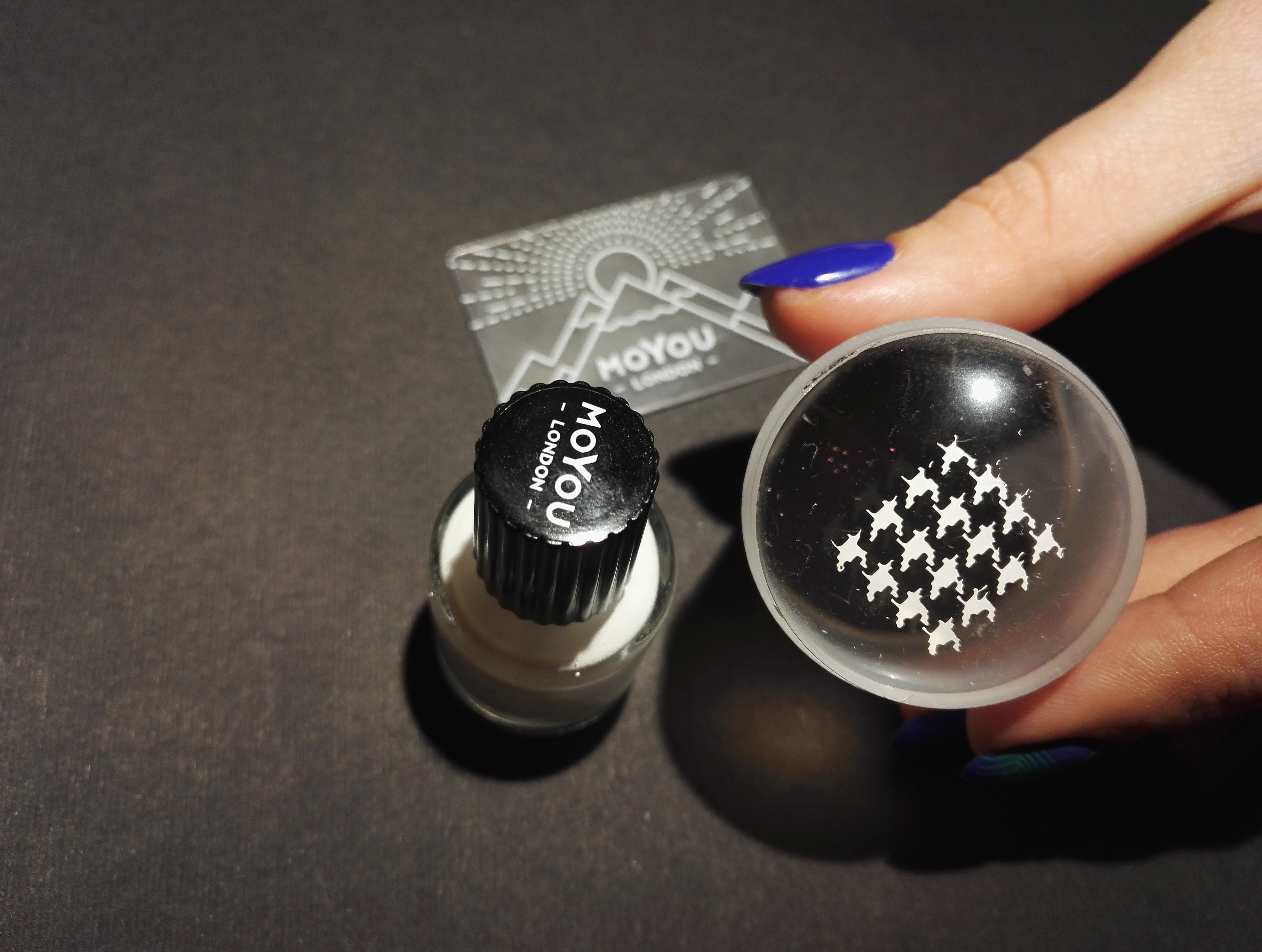 3) Pārnes zīmējumu uz zīmodziņa, viegli pārrulējot zīmodziņu pāri iegravētajam dizainam. Rezultātā jāsanāk vienmērīgam dizainam ar precīzām kontūrām, ja tas ar pirmo reizi neizdodas, zīmogu notīra (meistare izmanto pūku noņēmēju, jo zīmoga virsma ir ļoti smakla un to nedrīkst tīrīt ar nagu lakas noņēmēju utt.) un atkārto procesu vēlreiz. Kā atzīst meistare tieši kvalitatīvs zīmogs ir svarīgākā tehnikas sastāvdaļa. MoYou-London zīmogs ir ļoti ērts lietošanai, jo tas ir mīksts, ļaujot to ērti uzspiest uz naga un tā dibens ir caurspīdīgs, līdz ar to meistare redz konkrētu dizaina vietu, ko uzklāt uz naga