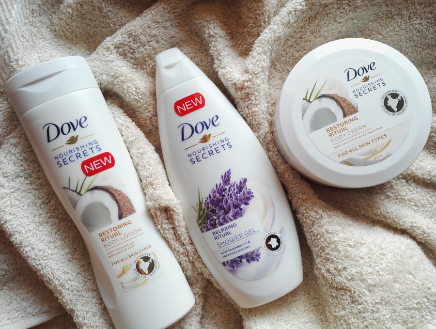 Viena no jaunākajām Dove ķermeņa kopšans sēriju Nurishing Secrets veido dušas želeja, ķermeņa losjons un ķermeņa krēms. Šajā sērijā pārstāvēti dažādi aromāti un aktīvās sastāvdaļas - ar lotosa zieda ekstraktu, rīsu ūdeni, avokado eļļu, kalendulas ekstraktu, lavandas eļļu, rozmarīnu, kokosriekstu eļļu, mandeļu pienu, marulas eļļu un mango sviestu. Esmu iepazinusies ar kokosriekstu ķermeņa krēmu un losjonu, kā arī lavandas dušas želeju, par ko pastāstīšu savā atsauksmē.