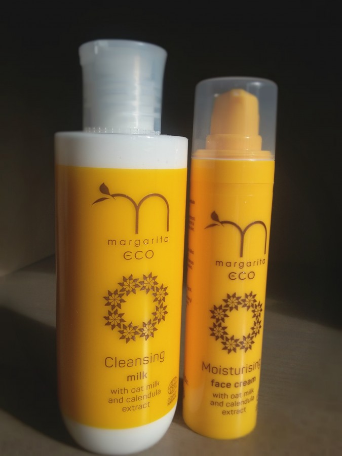 Manā pirkumu groziņā iekrita Margarita attīrošais pieniņš ar auzu pieniņu un kliņģerīšu ekstraktu un mitrinošais sejas krēms ar auzu pieniņu un kliņģerīšu ekstraktu - produkti, kas viens otru papildina.