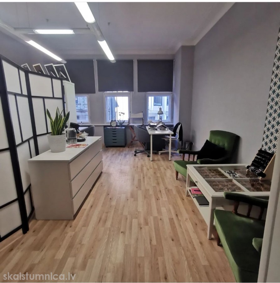 Kabinets gaišs un 30m2 plašs. Pilnībā aprīkots ar mēbelēm un protams ir izlietne. Gatavs uzņemt Tavus klientus kaut vai rīt.