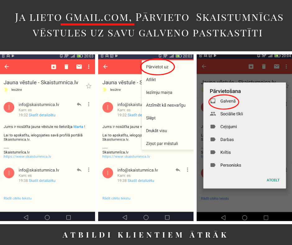Ja lietojat Gmail e-pastu, pārliecinaties, vai šie paziņojumi nenonāk Jūsu e-pasta reklāmu (spam) sadaļā. Lai to labotu sekojiet zemāk minētajām norādēm.
