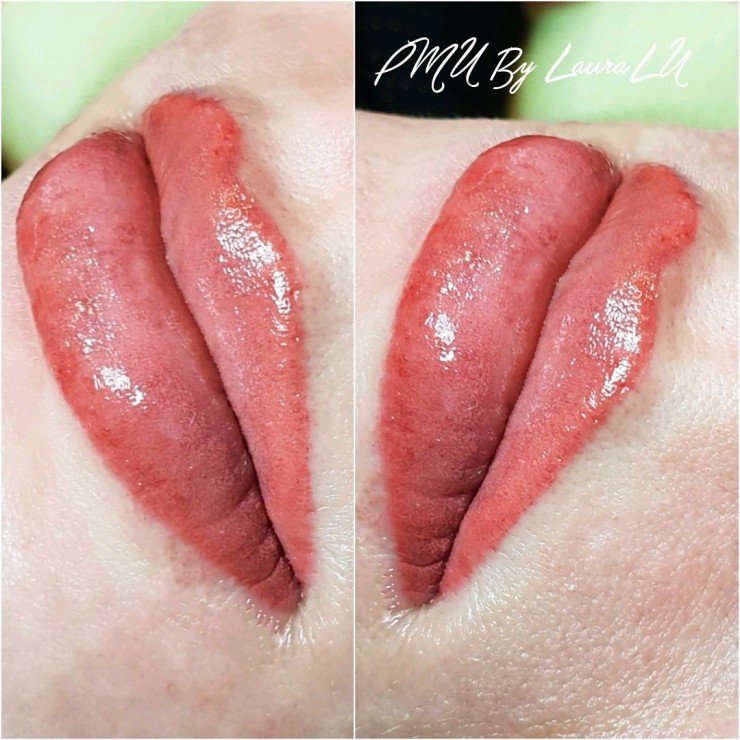 Lūpu permanentais meikps uzreiz pēc procedūras - bez izteiktām līnijām. Sadzīstot krāsa kļūs par ~40% gaišāka.