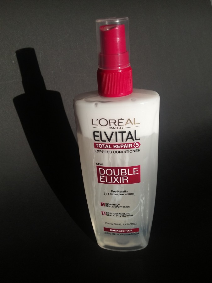 L'Oreal Elvital Double Elixir sērijā ir pieejami 4 veidu izsmidzināmie kondicionieri: Arginine Resist - nostiprinošs kondicionieris vājiem matiem; Extraordinary Oil - sausiem matiem; Fibralogy Double Elixir - apojumu zaudējušiem matiem un Total Repair5 - bojātiem matiem, kuru es iegādājos.